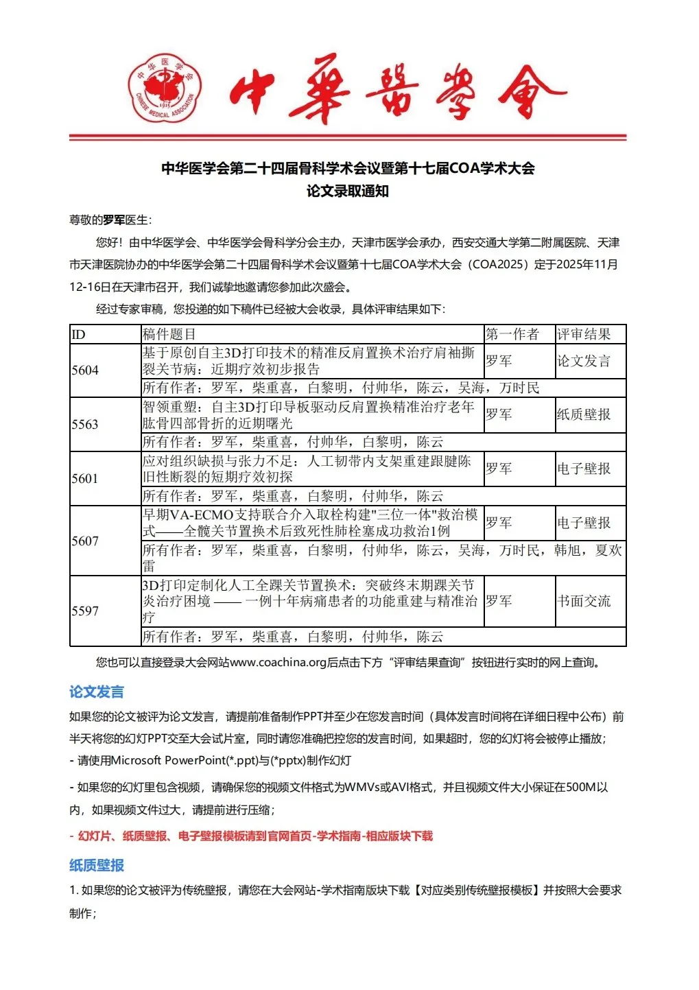 COA学术大会是我国骨科界水平最高、影响力最广的学术会议。本届COA2025以“数智骨科·共拓未境”为主题,共收到来自全国的投稿37,222篇,录用竞争极为激烈。在此背景下,我院论文能够连续在如此高规格的平台上进行“大会发言”,实属不易。这一成绩,是我院骨科团队长期专注于临床科研、潜心积累的成果体现。