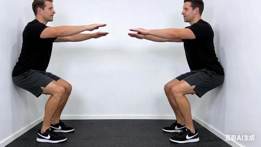 背部贴墙,双脚与肩同宽, 缓慢下蹲至膝盖微屈(不超过90度), 保持30秒,重复3次。