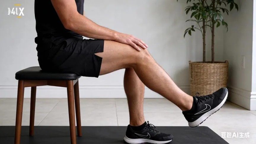 坐于椅子边缘,背部挺直,缓慢伸直膝盖,在最高点保持3秒,每组10-15次,每日2组。